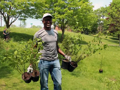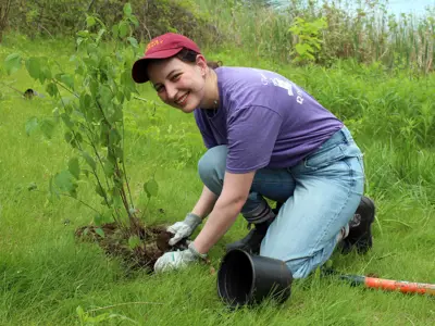 A variety of native species of trees and shrubs including button bush, speckled alder, tamarack, Saskatoon serviceberry, and silky dogwood will increase species diversity and enhance habitat for local wildlife in the area adjacent to the Otonabee River on the Riverview Park and Zoo grounds.