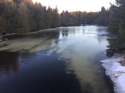 As the slushy frazil ice flows downstream, it will eventually come to rest against obstructions like islands, bridge piers, and abutments. It also comes to rest in low velocity areas around bends and over slope reductions and in areas where the channel constricts.